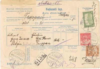 | Uherská dobírková poštovní poukázka odeslaná z pošty Bánská Bystrica (Beszterczebánya) 3. 2. 1919 do Žiliny. Frankovaná uherskými výplatními známkami použitými jako československé souběžné známky 5f Ženci, 2x 15f Ženci, 2x 10f Karel a uherskou doplatní známkou 2f Červené číslice použitou k úhradě fiskálního (?) poplatku. Na zadní straně příchozí razítko Žilina (Zsolna) 3. 2. 1919. | |||||