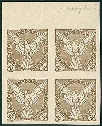 Ve sbírce mám **NV5N 20h fialovou, u tohoto exempláře mohu předložit i ZT této hodnoty (NV - 5 N zkusmý tisk na hnědém papíru), NV6N 30h - žlutoolivová - tento exemplář mám sice po nálepce, ale samozřejmě se znaleckou značkou, dále vlastním ** blok nevydaných známek NV6Nb - 30 h - tmavohnědé, tento exemplář je taktéž zkoušen znalcem a poloha znalecké značky odpovídá poloze nevydané známky. Navíc blok pochází z horního okraje, takže lze snadno určit jednotlivá známková pole a TD. Pokud jde toto identifikovat a určit u takto vzácných exemplářů, je to dobré zjištění pro každého sběratele. Problém ale vzniká v případě, pokud nemůže určit bezpečně odstín a nemáme žádný další srovnávací materiál. Zde pak musíme požádat o pomoc znalce. Navíc, pokud exemplář nemá žádnou znaleckou značku je to velmi nepováženou.