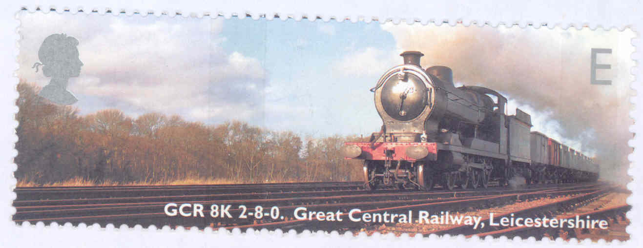 carriages alongside the shore of the Forth Estuary. E Class - GCR 8K 2-8-0. This stamp has the GCR 2.8.0
