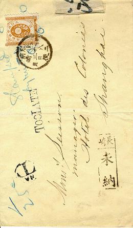 stamp was badly damaged and this is the most likely reason for the postage due request. It is interesting, that both the Nagasaki Mino (local mail due mark) and the postage due sign for foreign mail - the NA on T - are applied. There is no foreign mail cancellation on the cover, but it did reach Shanghai.