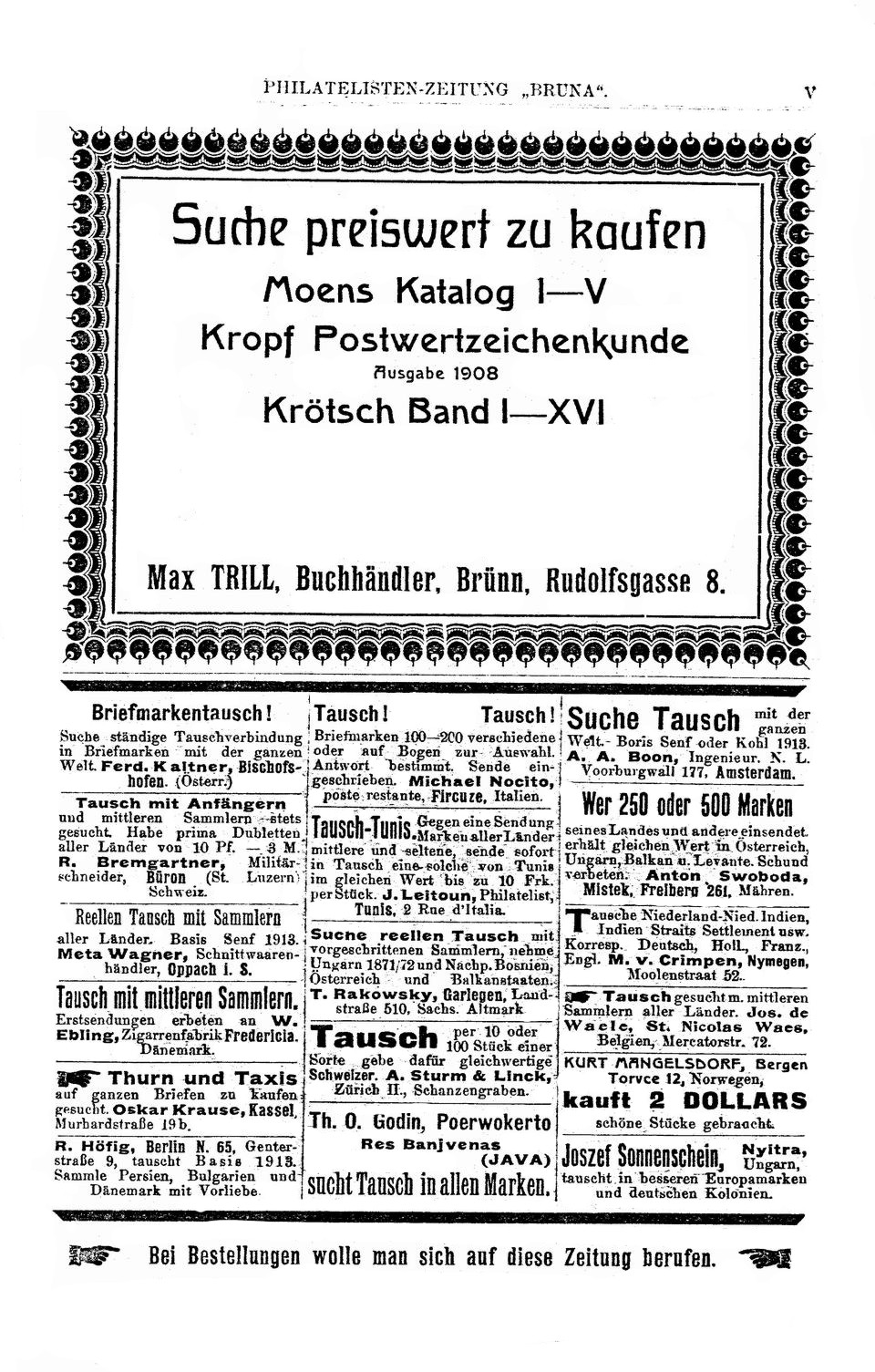"BRUNA", 1. JAHRGANG, Nr. 1, 1. NOVEMBER 1912 OFFIZIELLES ORGAN DES PHILATELISTENKLUB "BRUNA" IN BRÜNN |