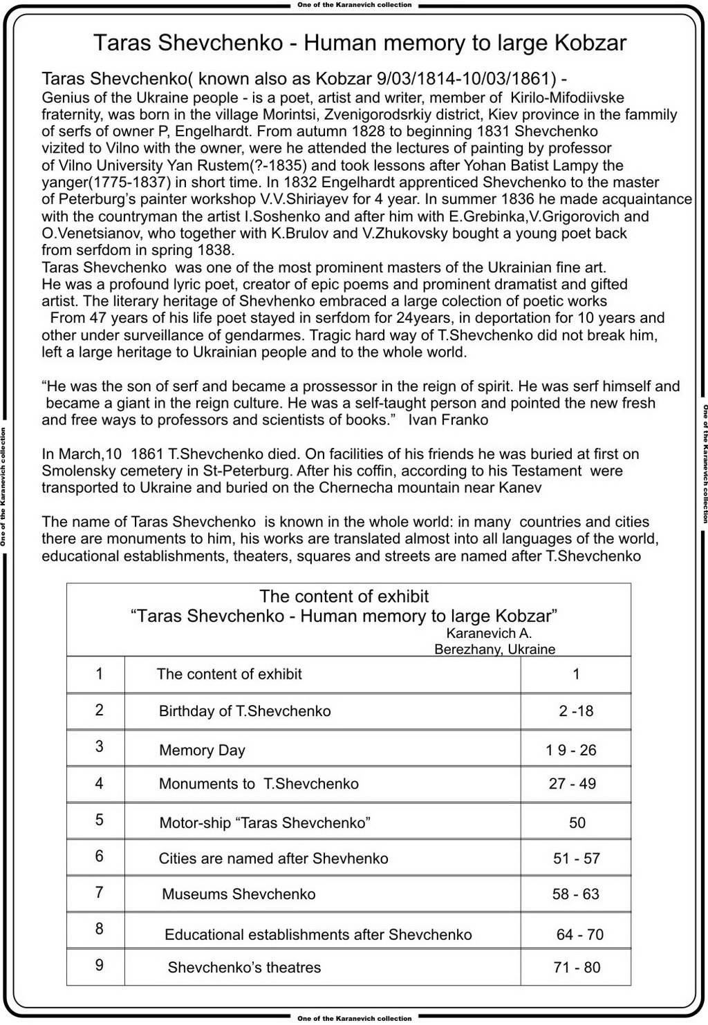 EXHIBIT:  TARAS SCHEVCHENKO - HUMAN MEMORY TO LARGE KOBZAR
